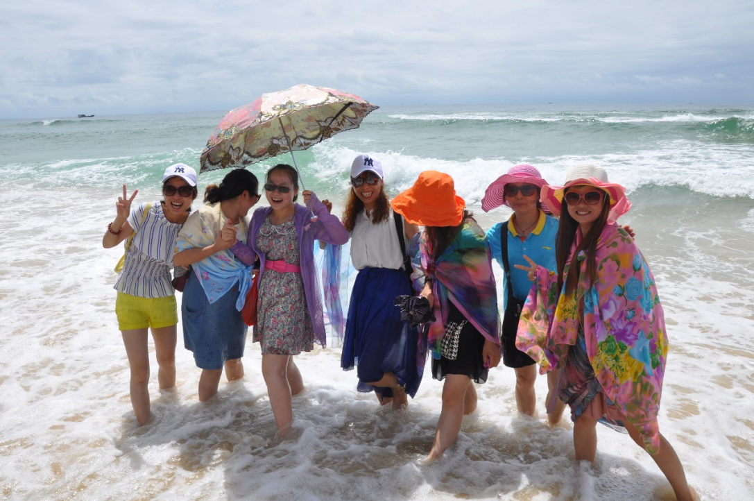 我們的女同事都披上了夏威夷風格的海灘披巾,怕被炙熱的太陽曬傷,墨鏡、大遮沿太陽帽、太陽傘等裝備齊全。盡管毒辣的太陽也無法阻擋我們對大海的熱愛,趕緊脫掉鞋子去海水里走走,一起與大海拍照留念。