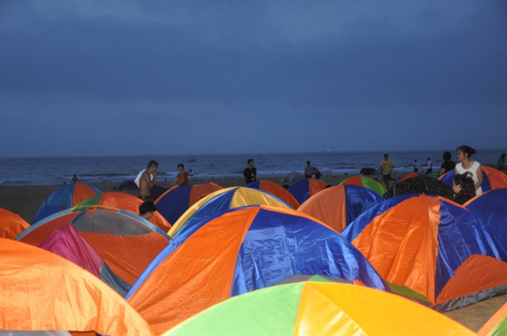 集體海邊露營等待第二天早上觀看海邊日出
